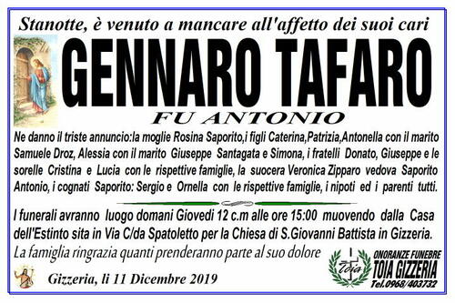 I funerali avranno luogo domani Giovedi 12 c.m alle ore 15:00 muovendo dalla Casa
