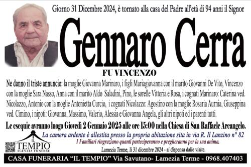 Le esequie avranno luogo Giovedì 2 Gennaio 2025 alle ore 15:00 nella Chiesa di San Raffaele Arcangelo.