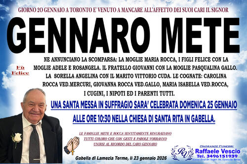 NE ANNUNCIANO LA SCOMPARSA: LA MOGLIE MARIA ROCCA, I FIGLI FELICE CON LA MOGLIE ADELE E ROSANGELA. IL FRATELLO GIOVANNI CON LA MOGLIE PASQUALINA GALLO. LA SORELLA ANGELINA CON IL MARITO VITTORIO CUDA. LE COGNATE: CAROLINA ROCCA VED.MERCURI, GIOVANNA ROCCA VED.GALLO, MARIA ISABELLA VED.ROCCA.I CUGINI, I NIPOTI ED I PARENTI TUTTI.UNA SANTA MESSA IN SUFFRAGIO SARA' CELEBRATA DOMENICA 25 GENNAIO ALLE ORE 10:30 NELLA CHIESA DI SANTA RITA IN GABELLA. LE FAMIGLIE METE E ROCCA SENTITAMENTE RINGRAZIANO TUTTI COLORO CHE CON GESTI E PAROLE VORRANNO UNIRSI AL RICORDO DEL CARO GENNARO.