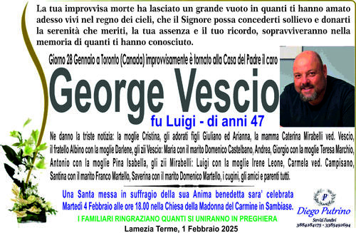 Ne danno la triste notizia: la moglie Cristina, gli adorati figli Giuliano ed Arianna, la mamma Caterina Mirabelli ved. Vescio, il fratello Albino con la moglie Darlene, gli zii Vescio: Maria con il marito Domenico Castelbano, Giorgio con la moglie Teresa Marchio, Antonio con la moglie Pina Isabella, gli zii Mirabelli: Luigi con la moglie Irene Leone, Carmela ved. Campisano, Santina con il marito Franco Martello, Saverina con il marito Domenico Martello, i cugini, gli amici e parenti tutti.