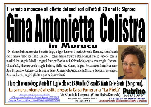 I funerali avranno luogo Martedi 31 Luglio alle ore 15,30 nella Chiesa di S. Maria Delle Grazie ( Zangarona).