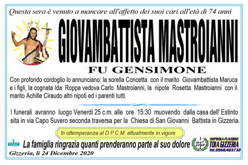 I funerali avranno luogo Venerdi 25 c.m. alle ore 15:30 muovendo dalla casa dell' Estinto