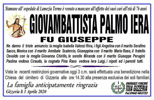 chiesa del cimitero di Gizzeria alle ore 14.30 alla presenza esclusiva dei soli familiari.