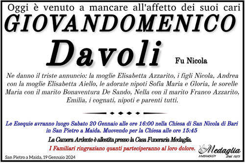 è venuto a mancare all'affetto dei suoi cari il Signor Giovandomenico Davoli ne danno il triste annuncio la moglie Elisabetta Azzarito, i figli Nicola, Andrea con la moglie Elisabetta Aiello, le adorate nipoti Sofia Maria e Gloria, le sorelle Maria con il marito Bonaventura De Sando, Nella con il marito Franco Azzarito, Emilia, i cognati, nipoti e parenti tutti. Le Esequie avranno luogo giorno 20 Gennaio alle ore 16:00 nella Chiesa di San Nicola di Bari in San Pietro a Maida. Muovendo per la Chiesa alle ore 15:45. La Camera Ardente è allestita presso la Casa Funeraria Medaglia.