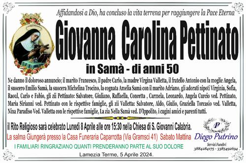 Ne danno il doloroso annuncio; il marito Francesco, il padre Carlo, la madre Virgina Valletta, il fratello Antonio con la moglie Angela, il suocero Emilio Samà, la suocera Michelina Trocino, la cognata Amelia Samà con il marito Adriano, gli adorati nipoti Virginia, Sofia, Raoul, Carlo e Fabio, gli zii Pettinato: Salvatore, Giuliano, Raffaella, Concetta , Carmela, Leonardo, Angela Curcio ved. Pettinato, Maria Sirianni ved. Pettinato con le rispettive famiglie, gli zii Valletta: Salvatore, Aldo, Giulio, Graziella Torcasio ved. Valletta, Nina Paradiso Ved. Valletta con le rispettive famiglie, La zia Nella Samà ved. D’Ippolito, i cugini amici e parenti tutti.