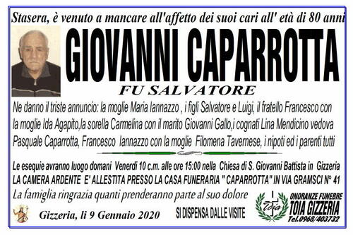 Le esequie avranno luogo domani Venerdi 10 c.m. alle ore 15:00 nella Chiesa di S. Giovanni Battista in Gizzeria