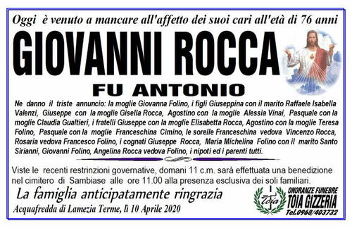 nel cimitero di Sambiase alle ore 11.00 alla presenza esclusiva dei soli familiari.