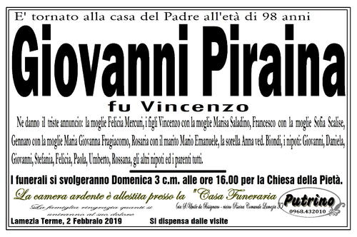I funerali si svolgeranno Domenica 3 c.m. alle ore 16.00 per la Chiesa della Pietà .