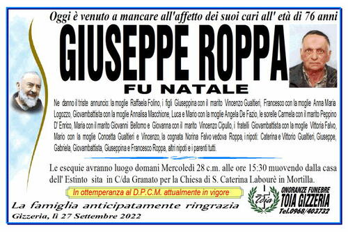 Le esequie avranno luogo domani Mercoledì 28 c.m. alle ore 15:30 muovendo dalla casa
