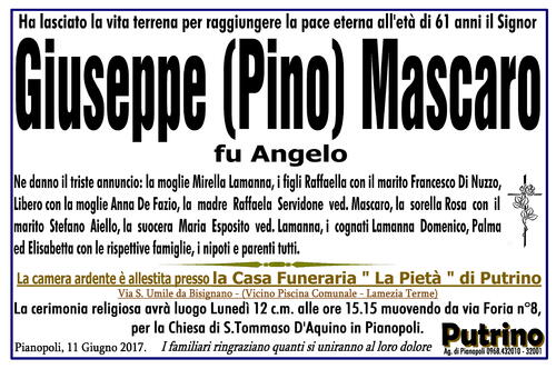 La camera ardente è allestita presso la Casa Funeraria '' La Pietà '' di Putrino