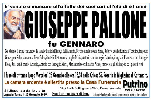 I funerali avranno luogo Mercoledì 23 Gennaio alle ore 15,30 nella Chiesa SS. Rosario in Miglierina di Catanzaro.