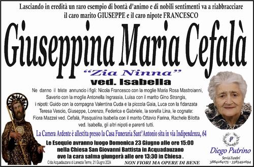 Ne danno il triste annuncio i figli: Nicola Francesco con la moglie Maria Rosa Mastroianni, Saverio con la moglie Antonella Ingrassia, Luisa con il marito Gino Strangis, i nipoti: Guido con la compagna Valentina Cuda e la piccola Gaia, Luca con la fidanzata Teresa Vescio, Giuseppe, Lorenzo, Federica e Gabriele, la sorella Lina, le cognate: Fiora Mazzei ved. Cefalà, Pasqualina Isabella con il marito Ottavio Farina, Rachele Bilotta ved. Isabella, gli altri nipoti e parenti tutti.