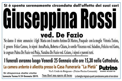 La camera ardente è allestita presso la Casa Funeraria ''La Pietà '' PUTRINO