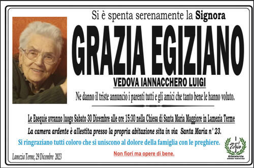 Le Esequie avranno luogo Sabato 30 Dicembre alle ore 15:30 nella Chiesa di Santa Maria Maggiore in Lamezia Terme.