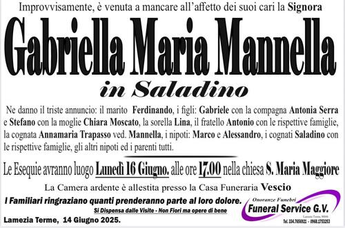 Le Esequie avranno luogo Lunedì 16 Giugno. alle ore 17.00 nella chiesa S. Maria Maggiore