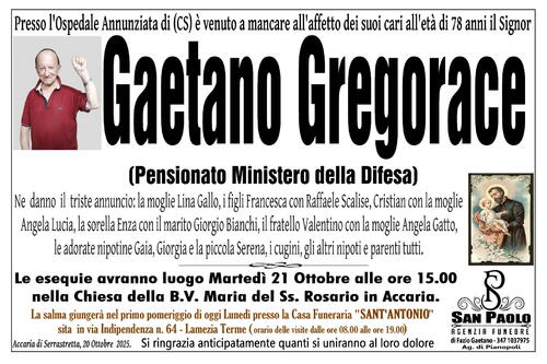 Ne danno il triste annuncio: la moglie Lina Gallo, i figli Francesca con Raffaela Scalise, Cristian con la moglie Angela Lucia, la sorella Enza con il marito Giorgio Binachi, il fratello Valentino con la moglie Angela Gatto, le adorate nipotine Gaia, Giorgia e la piccola Serena, i cugini, gli altri nipoti e parenti tutti.