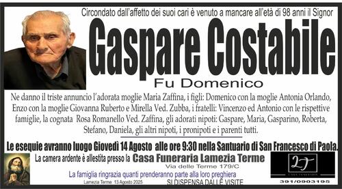 Ne danno il triste annuncio l’adorata moglie Maria Zaffina, i figli: Domenico con la moglie Antonia Orlando,