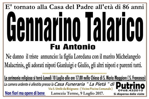 La camera ardente è allestita presso la Casa Funeraria '' La Pietà '' di Putrino