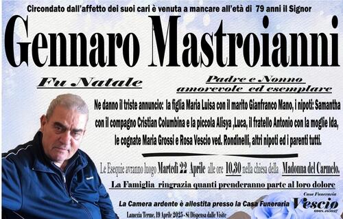 Ne danno il triste annuncio: la figlia Maria Luisa con il marito Gianfranco Mano, i nipoti: Samantha con il compagno Cristian Columbina e la piccola Alisya ,Luca, il fratello Antonio con la moglie Ida, le cognate Maria Grossi e Rosa Vescio ved. Rondinelli, altri nipoti ed i parenti tutti.
