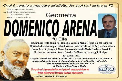 Ne danno il triste annuncio: la moglie Carmela Arena, il figlio Elia con la moglie Alessandra Catania, i nipoti Sofia, Rosaria e Domenico, la sorella Angela con il marito Benito Azzarito, i cognati: Nicola Arena con la moglie Maria Elisabetta Ferraiolo, Elisabetta Azzarito ved. Arena, Caterina De Marco ved. Arena, gli zii, nipoti e parenti tutti.