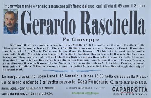 Ne danno il triste annuncio: la moglie Franca Villella, i figli Antonella con il marito Danilo Villella, Giuseppe con la moglie Jessica De Cicco, i fratelli Giacomo con la moglie Giovanna Curcio, Domenico con la moglie Anna Maria Fuda, Angela con il marito Giovanni Michienzi, Giovanni con la moglie Antonella Gallo, Maurizio con la moglie Concetta Cuda, Marcello con la moglie Rosaria De Gennaro, le cognate Giusy Ventura Ved. Raschella, Rosa Butruce Ved. Raschella, i cognati Villella: Lina con il marito Albano Giudice, Bruno con la moglie Teresa Damiano, Angela con il marito Franco Torcasio, Carmelina con il marito Giovanni Falvo, Salvatore con la moglie Milena Andricciola e Franco, i suoceri Domenico Villella e Miranda Sauro, gli amati nipotini Ginevra, Gabriele e Beatrice, gli altri nipoti e parenti tutti.