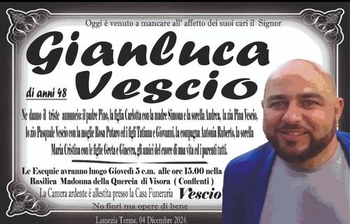 La Camera ardente è allestita presso la Casa Funeraria Vescio
