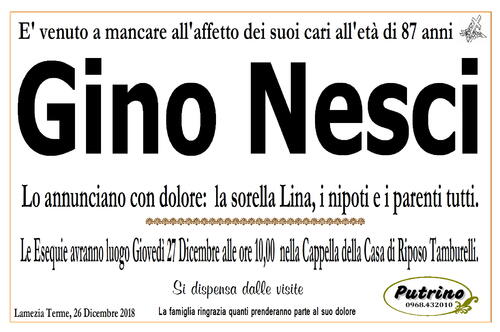 Le Esequie avranno luogo Giovedì 27 Dicembre alle ore 10,00 nella Cappella della Casa di Riposo Tamburelli.