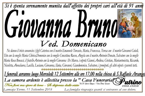 I funerali avranno luogo Mercoledì 12 Settembre alle ore 17,00 nella chiesa di S.Raffaele Arcangelo.