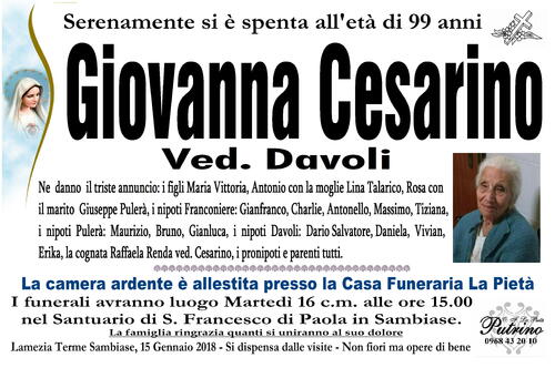 I funerali avranno luogo Martedì 16 c.m. alle ore 15.00