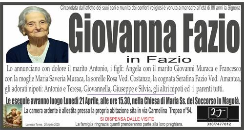 gli adorati nipoti: Antonio e Teresa, Giovannella, Giuseppe e Silvia, gli altri nipoti ed i parenti tutti.