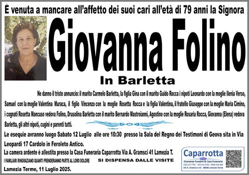 Ne danno il triste annuncio: il marito Carmelo Barletta, la figlia Gina con il marito Guido Rocca i nipoti Leonardo con la moglie Ilenia Verso, Samuel con la moglie Valentina Muraca, il figlio Vincenzo con la moglie Rosetta Rocca e la figlia Valentina, il fratello Giuseppe con la moglie Maria Cimino, i cognati Rosetta Mancuso vedova Folino, Drusolina Barletta con il marito Bernardo Mastroianni, Agostino con la moglie Rosaria Rocca, Giovanna (Elena) vedova Barletta, gli altri nipoti, cugini e parenti tutti.