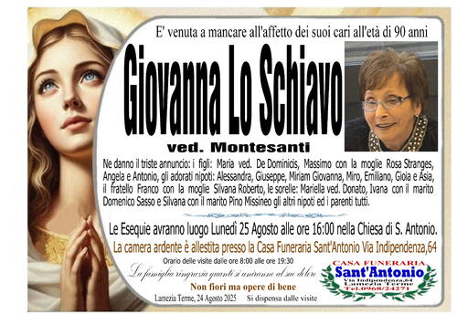 Ne danno il triste annuncio i figli: Maria ved. Dominicis, Massimo con la moglie Rosa Stranges, Angela e Antonio, gli adorati nipoti: Alessandra, Giuseppe, Miriam Giovanna, Miro, Emiliano, Gioia e Asia, il fratello Franco con la moglie Silvana Roberto, le sorelle: Mariella ved. Donato, Ivana con il marito Domenico Sasso e Silvana con il marito Pino Missineo, gli altri nipoti e parenti tutti.