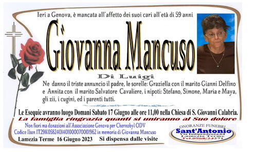 Ne danno il triste annuncio, il padre, le sorelle: Graziella con il marito Gianni Delfino e Annita con il marito Salvatore Cavaliere, i nipoti: Stefano, Simone, Maria e Maya, gli zii, i cugini ed i parenti tutti.