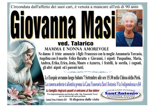 Ne danno il triste annuncio i figli: Francesco con la moglie Annamaria Torcasio, Angelina con il marito Felice Baratta e Giovanni, i nipoti: Pasqualino, Maria, Andrea, Erika, Erica, Jenia, Mauro e Azzurra, i fratelli, la sorella, i cognati, gli altri nipoti ed i parenti tutti.