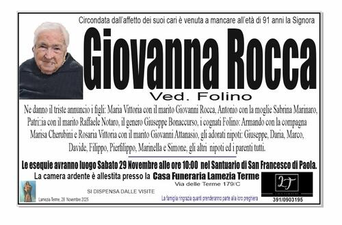 Ne danno il triste annuncio i figli: Maria Vittoria con il marito Giovanni Rocca, Antonio con la moglie Sabrina Marinaro,