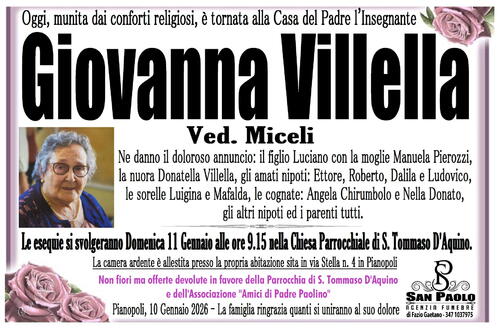 Le esequie si svolgeranno Domenica 11 Gennaio alle ore 9.15 nella Chiesa Parrocchiale di S. Tommaso D'Aquino.