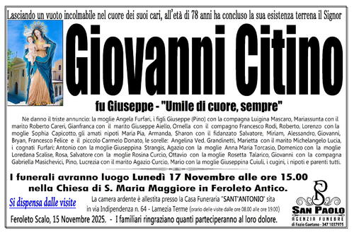 I funerali avranno luogo Lunedì 17 Novembre alle ore 15.00