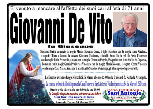 Ne danno il triste annuncio la moglie Maria Giovanna Cerra, il figlio Massimo con la moglie Anna Gaetano, le nipoti: Chiara e Serena, la suocera Giovanna Marinaro, i fratelli: Anna, Maria ved. De Fazio, Francesco con la moglie Lidia Petronella, Antonio con la moglie Giovanna Pupello, Pasqualina con il marito Mario Caporale, Domenico con la moglie Grazia Privitera e Vincenzo con la moglie Maria Nicotera, i cognati Cerra: Vincenzo con la moglie Sara Nasso, Anna con il marito Aldo Saladino e Giuseppe, gli altri nipoti ed i parenti tutti.