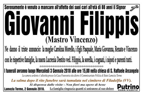 Lamezia Terme, 2 Gennaio 2018. La famiglia ringrazia quanti si uniranno al suo dolore