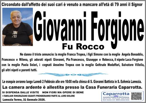 Ne danno il triste annuncio: la moglie Franca Tropea, i figli Simone con la moglie Angela Bonaddio, Francesco e Milena, gli adorati nipoti Giovanni, Pio Francesco, Giuseppe e Rebecca, il nipote Luca Forgione con la moglie Paola Solari, i cognati Anselmo Tropea con la moglie Geltrude Modaffari, Salvatore Villella, gli altri nipoti e parenti tutti.