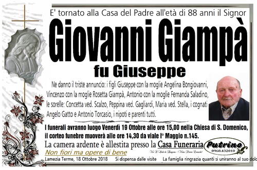 I funerali avranno luogo Venerdì 19 Ottobre alle ore 15,00 nella Chiesa di S. Domenico,