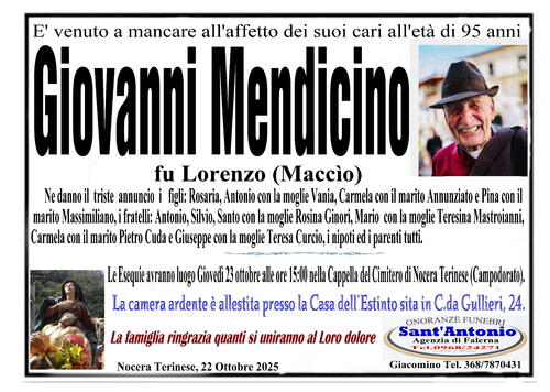 Ne danno il triste annuncio i figli: Rosaria, Antonio con la moglie Vania, Carmela con il marito Annunziato e Pina con il marito Massimiliano, i fratelli Antonio, Silvio, Santo con la moglie Rosina Ginori, Mario con la moglie Teresina Mastroianni, Carmela con il marito Pietro Cuda e Giuseppe con la moglie Teresa Curcio, i nipoti ed i parenti tutti.
