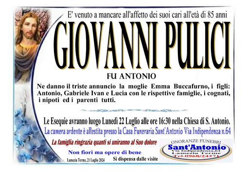Ne danno il triste annuncio la moglie Emma Buccafurno, i figli: Antonio, Gabriele Ivan e Lucia con le rispettive famiglie, i cognati, i nipoti ed i parenti tutti.