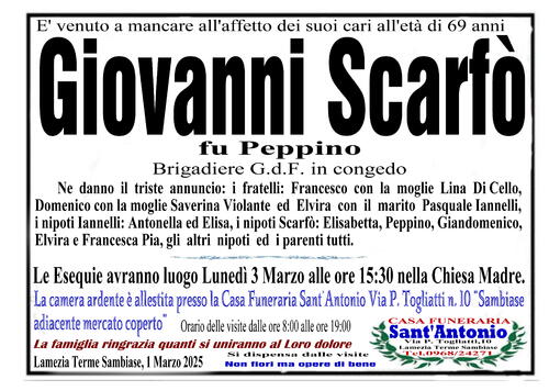 Ne danno il triste annuncio i fratelli: Francesco con la moglie Lina Di Cello, Domenico con la moglie Saverina Violante ed Elvira con il marito Pasquale Iannelli, i nipoti Iannelli: Antonella ed Elisa, i nipoti Scarfò: Elisabetta, Peppino, Giandomenico, Elvira e Francesca Pia, gli altri nipoti ed i parenti tutti.