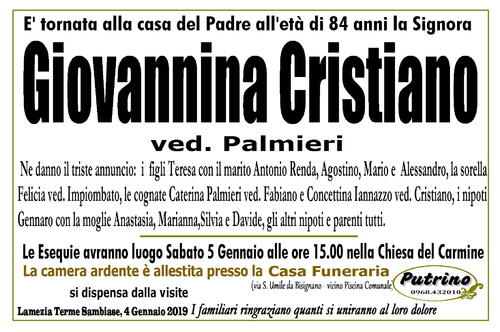 La camera ardente è allestita presso la Casa Funeraria Putrino