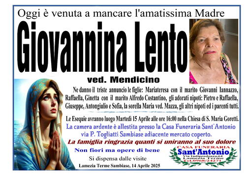 Ne danno il triste annuncio le figlie: Mariateresa con il marito Giovanni Iannazzo, Raffaella e Ginetta con il marito Alfredo Costantino, gli adorati nipoti: Pietro e Raffaella, Giuseppe, Antongiulio e Sofia, la sorella Maria ved. Mazza, gli altri nipoti ed i parenti tutti.