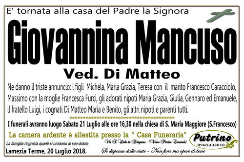 I funerali avranno luogo Sabato 21 Luglio alle ore 16,30 nella chiesa di S. Maria Maggiore (S.Francesco)