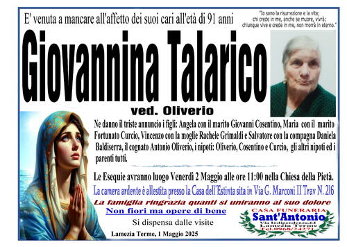 Ne danno il triste annuncio i figli: Angela con il marito Giovanni Cosentino, Maria con il marito Fortunato Curcio, Vincenzo con la moglie Rachele Grimaldi e Salvatore con la compagna Daniela Baldiserra, il cognato Antonio Oliverio, i nipoti: Oliverio, Cosentino e Curcio, gli altri nipoti ed i parenti tutti.