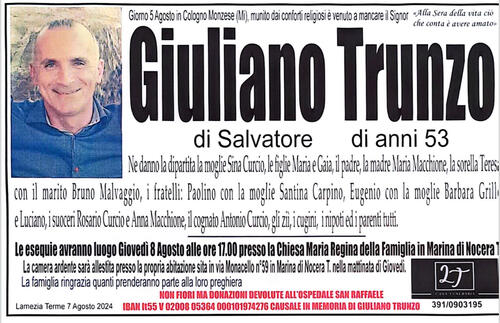 Ne danno la dipartita la moglie Sina Curcio, le figlie Maria e Gaia, il padre, la madre Maria Macchione, la sorella Teresa