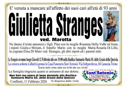 Ne danno il triste annuncio i figli: Pino con la moglie Rosanna Della Valle ed Irene, i nipoti Giulia e Miriam, il fratello Mario con la moglie Maria Rosaria Di Lillo, la cognata Elisa Di Maio ved. Stranges, gli altri nipoti ed i parenti tutti.